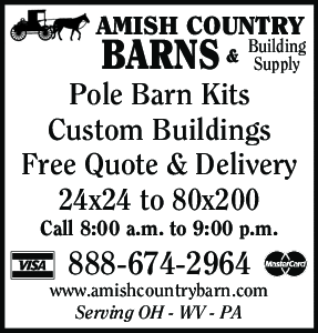 AMISH COUNTRY BARNS & Pole Barn Kits Custom Buildings Free Quote & Delivery 24×24 to 80×200 Call 8:00 a.m. to 9:00 p.m. 888-674-2964 www.amishcountrybarn.com Serving OH – WV – PA Building Supply