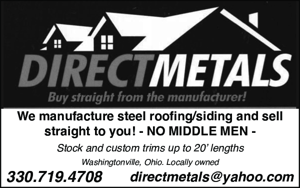 We manufacture steel roofing/siding and sell straight to you! – NO MIDDLE MEN – Stock and custom trims up to 20’ lengths Washingtonville, Ohio. Locally owned 330.719.4708 directmetals@yahoo.com