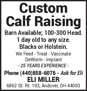 Custom Calf Raising Barn Available; 100-300 Head. 1 day old to any size. Blacks or Holstein. We Feed – Treat – Vaccinate DeWorm – Implant – 25 YEARS EXPERIENCE – Phone (440)858-6076 – Ask for Eli ELI MILLER 6862 St. Rt. 193, Andover, OH 44003 Custom Calf Raising Barn Available; 100-300 Head. 1 day old