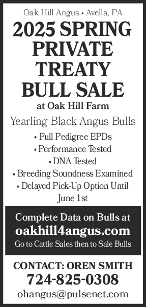 Oak Hill Angus • Avella, PA 2024 SPRING PRIVATE TREATY BULL SALE at Oak Hill Farm Yearling Black Angus Bulls • Full Pedigree EPDs • Performance Tested • DNA Tested • Breeding Soundness Examined • Delayed Pick-Up Option Until June 1st Complete Data on Bulls at oakhill4angus.com Go to Cattle Sales then to Sale Bulls