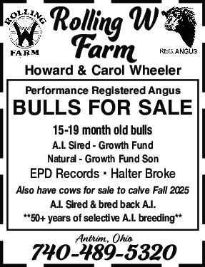 15-19 month old bulls A.I. Sired – Growth Fund Natural – Growth Fund Son EPD Records • Halter Broke Also have cows for sale to calve Fall 2025 A.I. Sired & bred back A.I. **50+ years of selective A.I. breeding** Performance Registered Angus BULLS FOR SALE Antrim, Ohio 740-489-5320 Rolling W Farm Howard & Carol