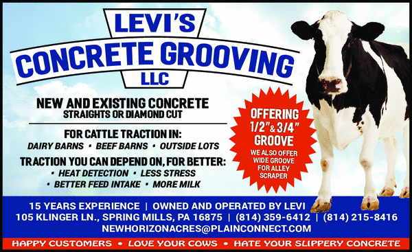 LEVI’S CONCRETE GROOVING LLC FOR CATTLE TRACTION IN: DAIRY BARNS • BEEF BARNS • OUTSIDE LOTS TRACTION YOU CAN DEPEND ON, FOR BETTER: • HEAT DETECTION • LESS STRESS • BETTER FEED INTAKE • MORE MILK NEW AND EXISTING CONCRETE Straights or Diamond Cut 15 YEARS EXPERIENCE | OWNED AND OPERATED BY LEVI 105 KLINGER