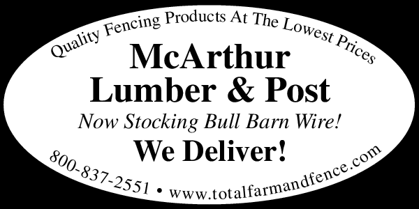 Qu ality Fenci ng Products At The Lowest Prices 800-837-2551 • www.totalfarman dfen ce.c om McArthur Lumber & Post Now Stocking Bull Barn Wire! We Deliver!