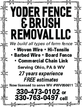 YODER FENCE & BRUSH REMOVAL LLC We build all types of farm fence • Woven Wire • Hi-Tensile • Barbed Wire • Board Fence • Commercial Chain Link Serving Ohio, PA & WV 27 years experience FREE estimates Now licensed to serve WV #WV050611 330-473-0102 or 330-763-0497 cell
