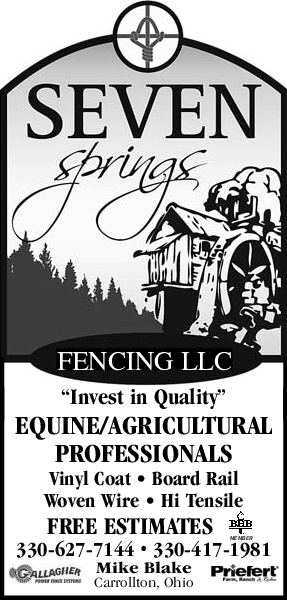 “Invest in Quality” EQUINE/AGRICULTURAL PROFESSIONALS Vinyl Coat • Board Rail Woven Wire • Hi Tensile 330-627-7144 • 330-417-1981 Mike Blake Carrollton, Ohio MEMBER FREE ESTIMATES FENCING LLC