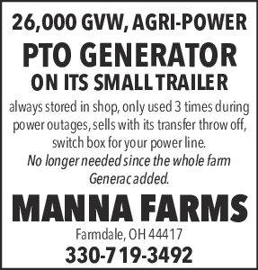 26,000 GVW, AGRI-POWER PTO GENERATOR ON ITS SMALL TRAILER always stored in shop, only used 3 times during power outages, sells with its transfer throw off, switch box for your power line. No longer needed since the whole farm Generac added. MANNA FARMS Farmdale, OH 44417 330-719-3492