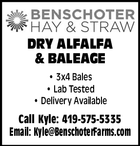 DRY ALFALFA & BALEAGE • 3×4 Bales • Lab Tested • Delivery Available Call Kyle: 419-575-5335 Email: Kyle@BenschoterFarms.com