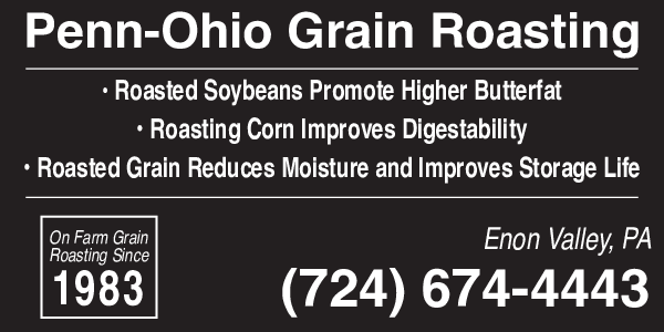 Penn-Ohio Grain Roasting • Roasted Soybeans Promote Higher Butterfat • Roasting Corn Improves Digestability • Roasted Grain Reduces Moisture and Improves Storage Life Enon Valley, PA (724) 674-4443 On Farm Grain Roasting Since 1983