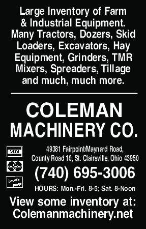 (740) 695-3006 49381 Fairpoint/Maynard Road, County Road 10, St. Clairsville, Ohio 43950 View some inventory at: Colemanmachinery.net COLEMAN MACHINERY CO. HOURS: Mon.-Fri. 8-5; Sat. 8-Noon Large Inventory of Farm & Industrial Equipment. Many Tractors, Dozers, Skid Loaders, Excavators, Hay Equipment, Grinders, TMR Mixers, Spreaders, Tillage and much, much more.