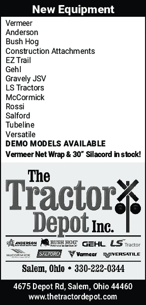New Equipment Vermeer Anderson Bush Hog Construction Attachments EZ Trail Gehl Gravely JSV LS Tractors McCormick Rossi Salford Tubeline Versatile DEMO MODELS AVAILABLE Vermeer Net Wrap & 30” Silacord in stock! 4675 Depot Rd, Salem, Ohio 44460 www.thetractordepot.com
