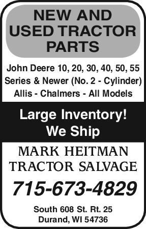 John Deere 10, 20, 30, 40, 50, 55 Series & Newer (No. 2 – Cylinder) Allis – Chalmers – All Models MARK HEITMAN TRACTOR SALVAGE 715-673-4829 South 608 St. Rt. 25 Durand, WI 54736 NEW AND USED TRACTOR PARTS Large Inventory! We Ship