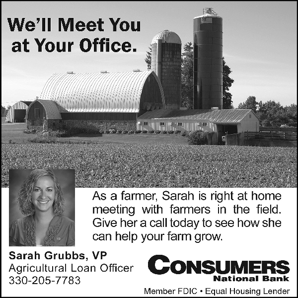 We’ll Meet You at Your Offi ce. Sarah Grubbs, VP Agricultural Loan Offi cer 330-205-7783 As a farmer, Sarah is right at home meeting with farmers in the fi eld. Give her a call today to see how she can help your farm grow. Member FDIC • Equal Housing Lender Consumers National Bank We’ll Meet