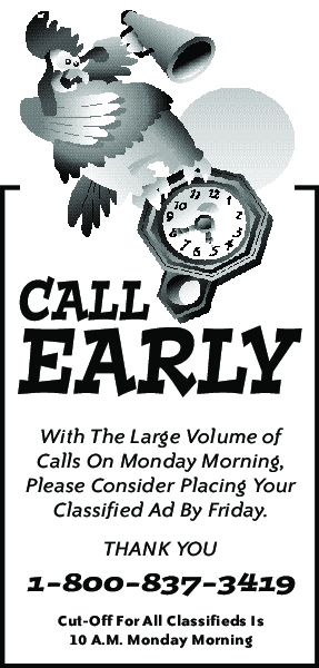 CALL EARLY With The Large Volume of Calls On Monday Morning, Please Consider Placing Your Classified Ad By Friday. THANK YOU 1-800-837-3419 Cut-Off For All Classifieds Is 10 A.M. Monday Morning