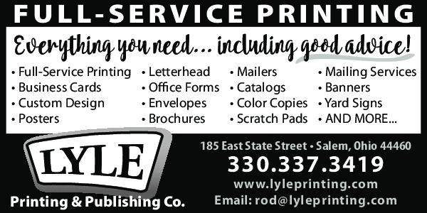 • Full-Service Printing • Business Cards • Custom Design • Posters Everything you need including good advice! 185 East State Street • Salem, Ohio 44460 330.337.3419 www.lyleprinting.com Email: rod@lyleprinting.com • Letterhead • Office Forms • Envelopes • Brochures F U L L – S E R V I C E P R I N T