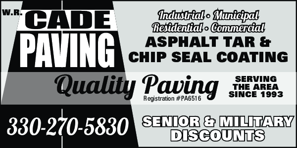 CADEW.R. Quality Paving Registration #PA6516 SERVING THE AREA SINCE 1993 Industrial • Municipal Residential • Commercial ASPHALT TAR & CHIP SEAL COATING 330-270-5830 SENIOR & MILITARY DISCOUNTS