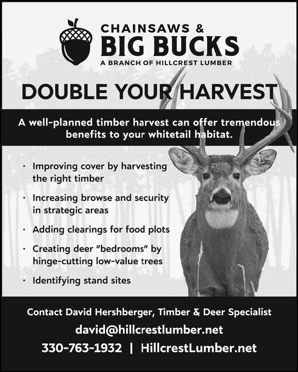 Chainsaws & Big Bucks A Branch of Hillcrest Lumber DOUBLE YOUR HARVEST A well-planned timber harvest can offer tremendous benefi ts to your whitetail habitat. • Improving cover by harvesting the right timber • Increasing browse and security in strategic areas • Adding clearings for food plots • Creating deer “bedrooms” by hinge-cutting low-value trees