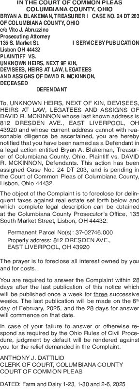 IN THE COURT OF COMMON PLEAS COLUMBIANA COUNTY, OHIO BRYAN A. BLAKEMAN, TREASURER | CASE NO. 24 DT 203 OF COLUMBIANA COUNTY, OHIO c/o Vito J. Abruzzino Prosecuting Attorney 135 S. Market St. | SERVICE BY PUBLICATION Lisbon OH 44432 PLAINTIFF VS. UNKNOWN HEIRS, NEXT 9F KIN, DEVISEES, HEIRS AT LAW, LEGATEES AND ASSIGNS OF
