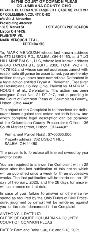 IN THE COURT OF COMMON PLEAS COLUMBIANA COUNTY, OHIO BRYAN A. BLAKEMAN, TREASURER | CASE NO. 24 DT 247 OF COLUMBIANA COUNTY, OHIO c/o Vito J. Abruzzino Prosecuting Attorney 135 S. Market St. | SERVICE BY PUBLICATION Lisbon OH 44432 PLAINTIFF VS. MARK MENOUGH, ET AL., DEFENDANTS To, MARK MENOUGH whose last known address is