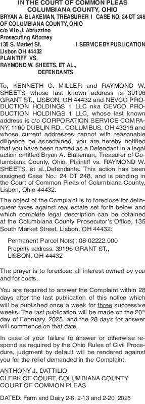 IN THE COURT OF COMMON PLEAS COLUMBIANA COUNTY, OHIO BRYAN A. BLAKEMAN, TREASURER | CASE NO. 24 DT 248 OF COLUMBIANA COUNTY, OHIO c/o Vito J. Abruzzino Prosecuting Attorney 135 S. Market St. | SERVICE BY PUBLICATION Lisbon OH 44432 PLAINTIFF VS. RAYMOND W. SHEETS, ET AL., DEFENDANTS To, KENNETH C. MILLER and RAYMOND W.