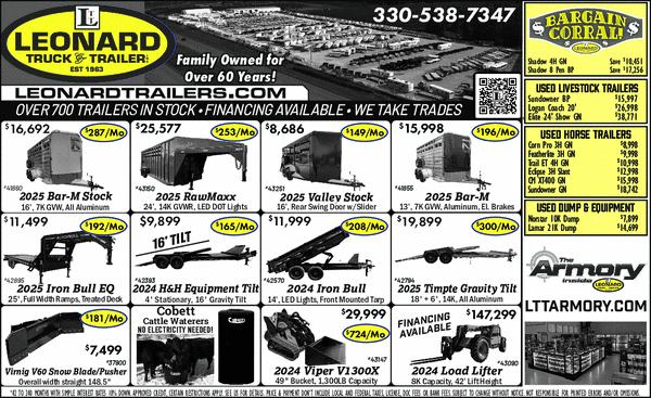 leonardtrailers.com OVER 700 TRAILERS IN STOCK • FINANCING AVAILABLE • WE TAKE TRADES 330-538-7347 Family Owned for Over 60 Years! LTTarmory.com 2025 RawMaxx 24’, 14K GVWR, LED DOT Lights $25,577 #43150 2025 Bar-M 13’, 7K GVW, Aluminum, El. Brakes $15,998 #41855 2024 H&H Equipment Tilt 4’ Stationary, 16’ Gravity Tilt $9,899 #42393 2025 Iron Bull