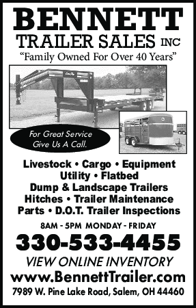 BENNETT TRAILER SALES INC “Family Owned For Over 40 Years” 8AM – 5PM MONDAY – FRIDAY VIEW ONLINE INVENTORY www.BennettTrailer.com 7989 W. Pine Lake Road, Salem, OH 44460 For Great Service Give Us A Call. Livestock • Cargo • Equipment Utility • Flatbed Dump & Landscape Trailers Hitches • Trailer Maintenance Parts • D.O.T. Trailer