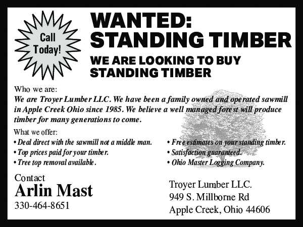 WANTED: STANDING TIMBER WE ARE LOOKING TO BUY STANDING TIMBER Who we are: We are Troyer Lumber LLC. We have been a family owned and operated sawmill in Apple Creek Ohio since 1985. We believe a well managed forest will produce timber for many generations to come. What we offer: • Deal direct with the