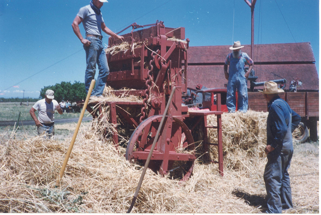 A Jacob Price Petaluma hay press in operation. The crew has filled and closed the press box and is waiting while the team pulls the rope to compress the oat hay. The photo was taken in 1985 and was sent to the author by the late Paul Reno, of Oakland, California, who restored the old press and is standing at right.
