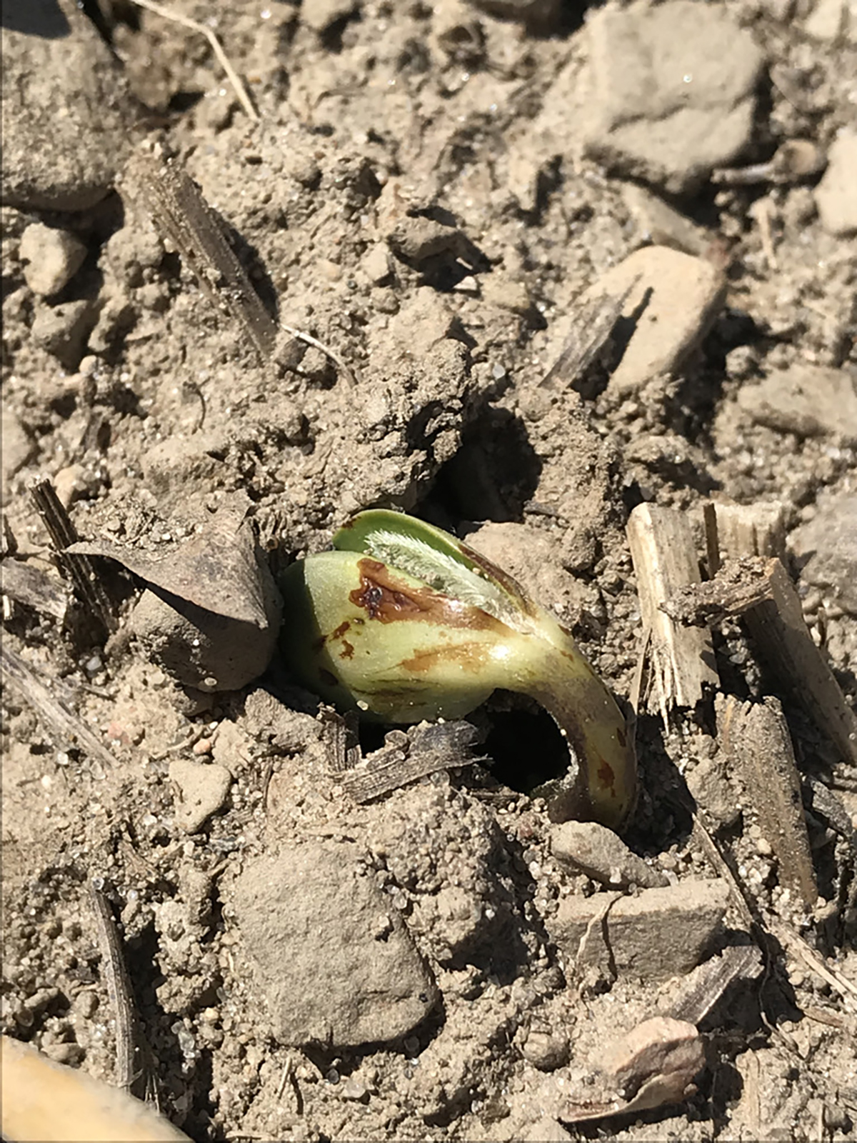 Damage from herbicides in crusted soil conditions is also a concern. Pre-emergent PPO herbicides such as flumioxazin, sulfentrazone and saflufenacil can injure young seedlings. If soybeans struggle too long to break through the soil surface, they can take up these herbicides and lead to injury. This injury can be mistaken for seedling diseases such as Pythium or Phytophthora. Soybeans with PPO herbicide injury will have dark purple or brown lesions that may lead to tissue necrosis near the soil surface.