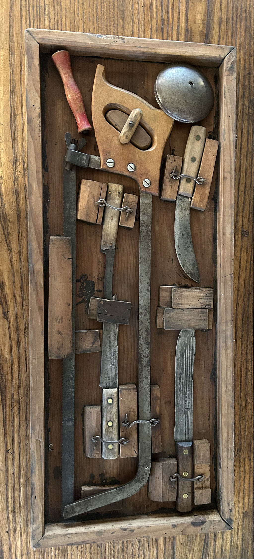 Next, the saws and knives that would be used in the process had to be cleaned and sharpened. There really is no such thing as an actual set of butchering knives, per se. Some farmers had only one or two knives, while others might have several. Each farmer sharpened and shaped the blades of their knives to their own particular style of cutting, often using a small, hand-cranked grinding wheel. Thus, butchering knives found on the market tend to baffle viewers regarding the odd shapes of the blades. And if a farmer couldn’t afford his own butchering knives, well, there were businesses that actually rented out knives for the purpose.