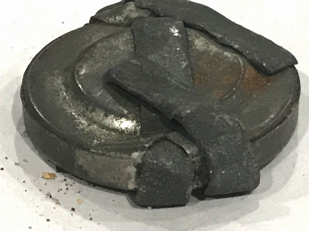 Joyce Hann found three tins (Item No. 1235) in a box at her late father’s house. She said they could be railroad related or they could be wine making related or they could be something else entirely. The tins are only 1.5 inches in diameter and about .25 inches thick. The strips appear to be lead and the substance inside is not salty. No markings are found.