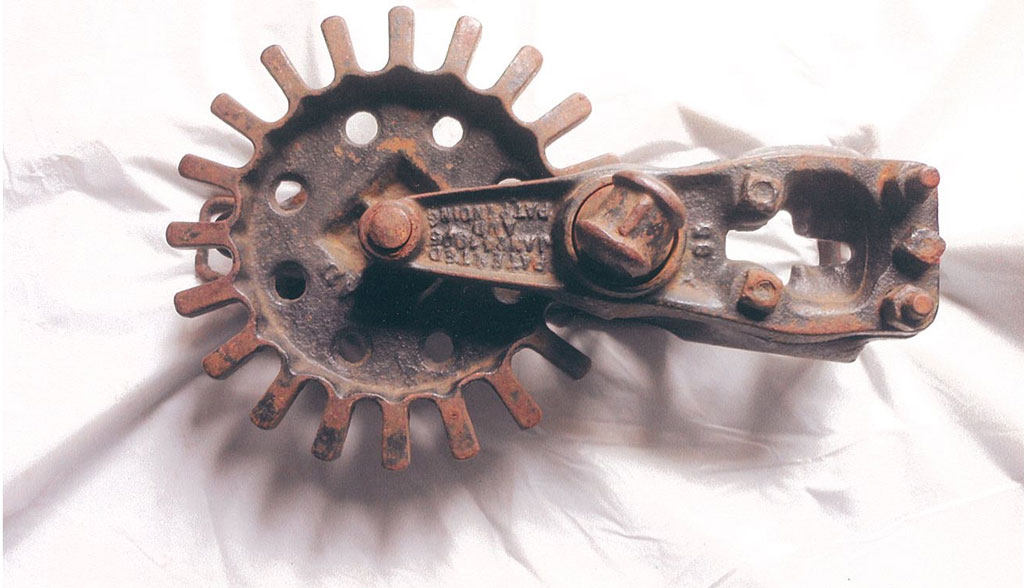 Clark Colby, North Huntingdon, Pennsylvania, gave us a detailed description: “It is a push-type MontaMower lawn mower made by the MontaMower Co. in Grand Rapids, Michigan. The nine vertical toothed wheels are ground-driven and in turn (no pun intended) drive the 16 sharpened horizontal cutter wheels which cut the grass blades with a scissors-like action. The MontaMower is kind of a cross between mail fraud and a reel-type push mower. Several decades ago, there used to be one at virtually every farm auction I attended in ‘used only once’ condition, for reasons that become apparent during attempted use. My prized example retains its original navy-blue finish and is the later style with the crossed-rods-type handle, like Ed’s. A simple Google search will return much additional information on this mechanical oddity, which reportedly was made in several versions form the late 1890s to maybe about 1950.”