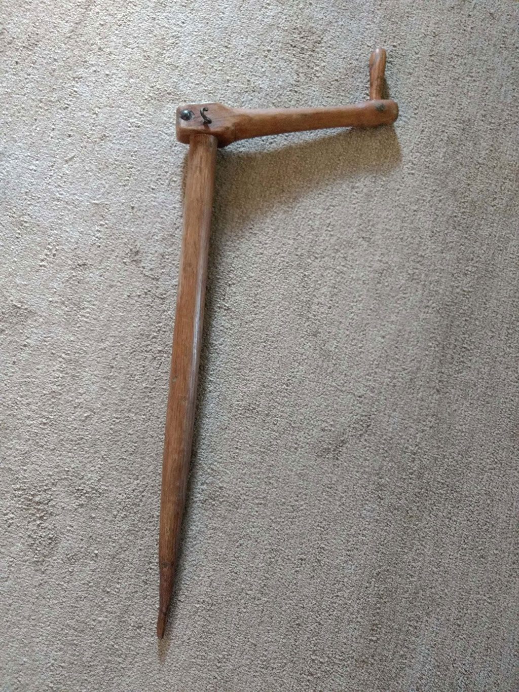 Mary Sonner recently purchased Item No. 1193 at an antique store. It is made of wood and is approximately 28 inches tall. The handle is 12 inches long. It has a pointed tip. Two metal pieces are present at the top of the main shaft. We have asked If you know what the item is or how it was used, email us at editorial@farmanddairy.com; or by mail to: Hazard a Guess, c/o Farm and Dairy, P.O. Box 38, Salem, OH 44460.
