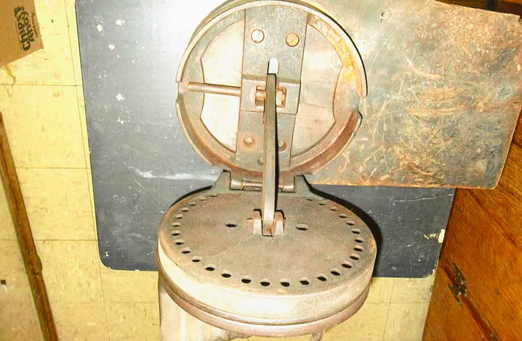 Richard Bader, of Middletown, New York, picked up Item No. 1125 at a yard sale. It is 9 inches in diameter, 6 1/2 inches in height when closed and weighs 12 pounds. There is a lever on the side that you can move to any hole on the disk. The peg on top has a handle and moves back and forth.