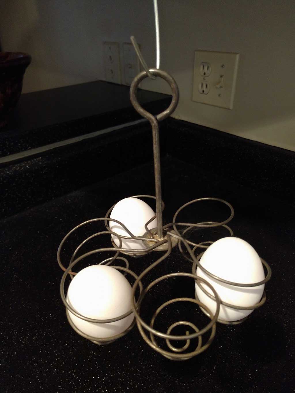 And so we move on to a new gizmo, sent in by Tom Saltsman, of Canton, Ohio. He says his 102-year-old neighbor — who usually knows what all his flea market finds are — encouraged him to submit it. Neither have seen Item No. 1128, although they’re assuming it’s used for eggs. It measures 6 inches across and 6 inches to the top of the ring, and the holders are 2 inches.