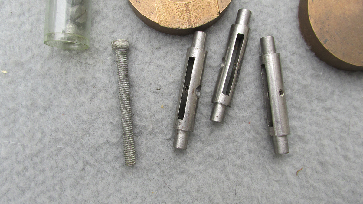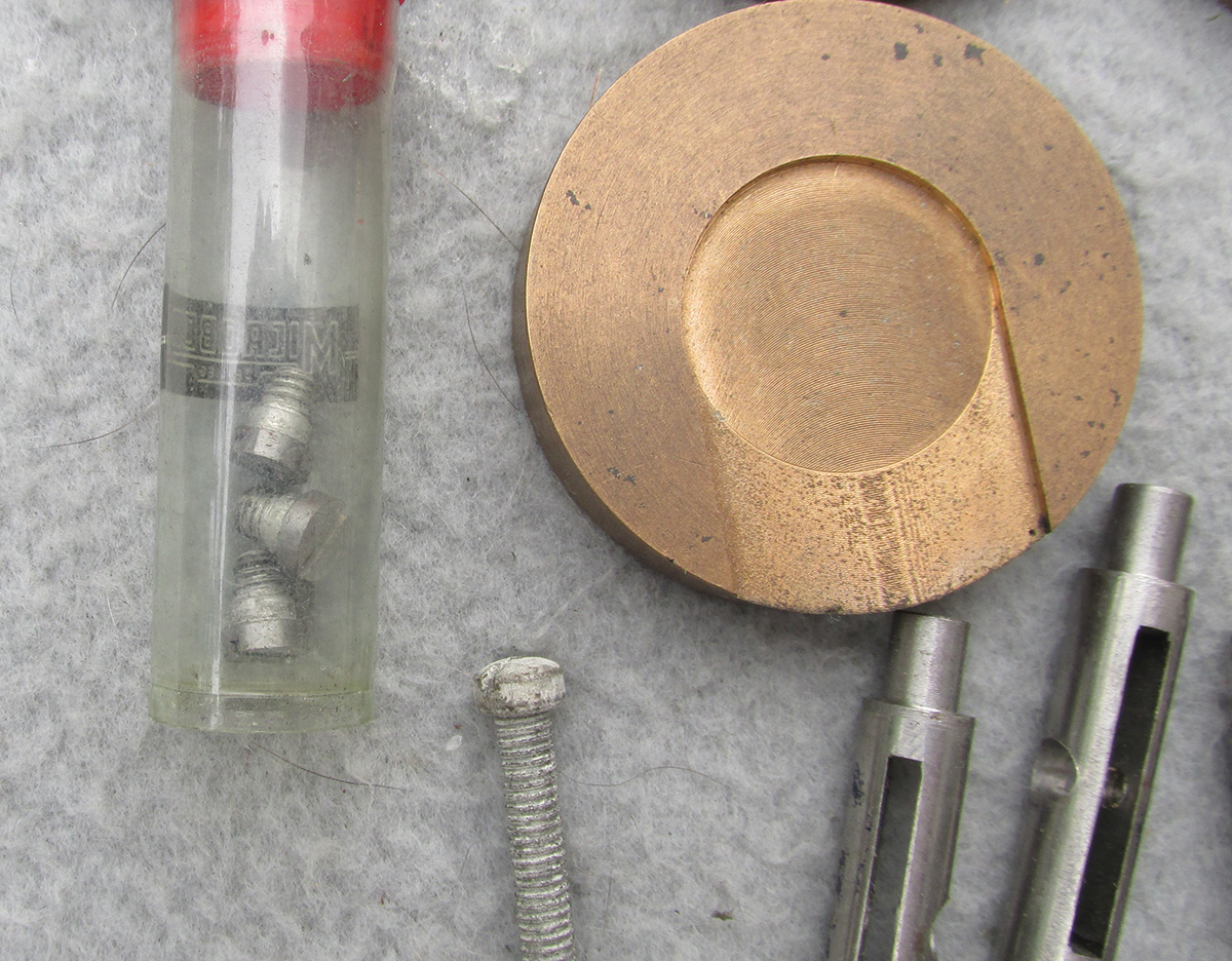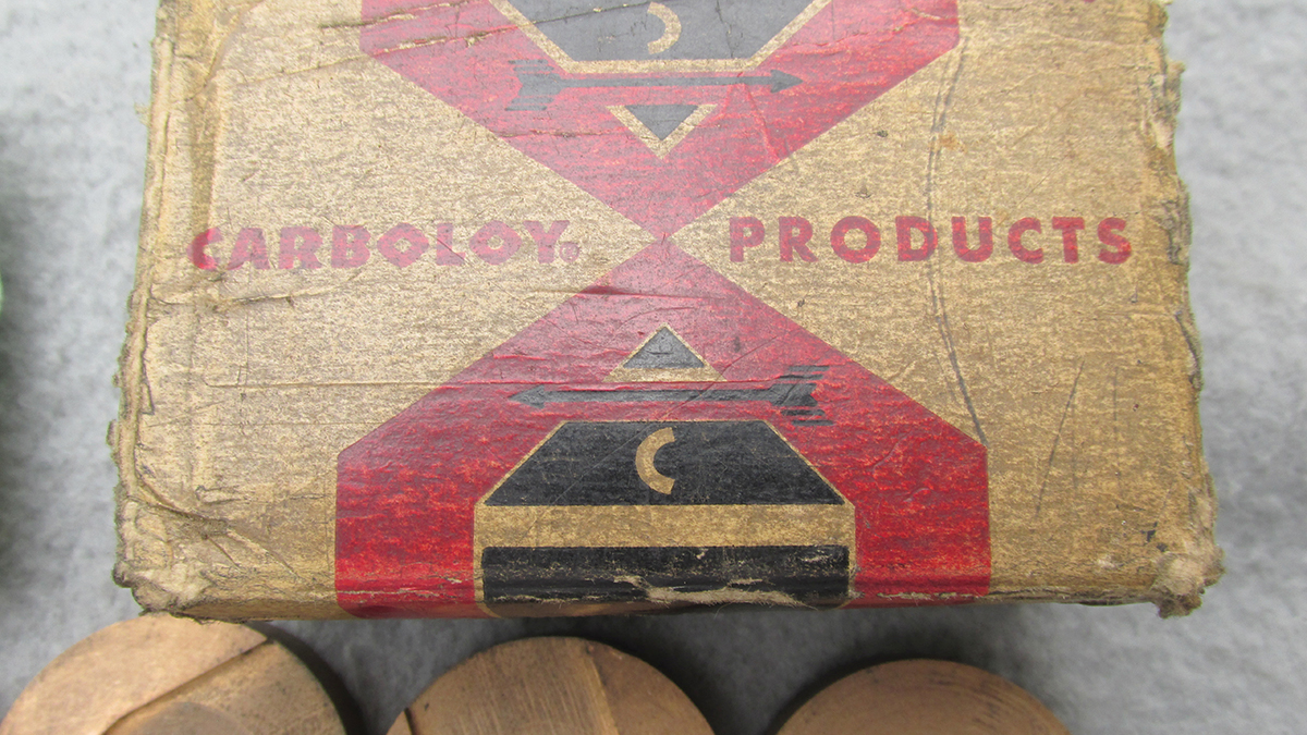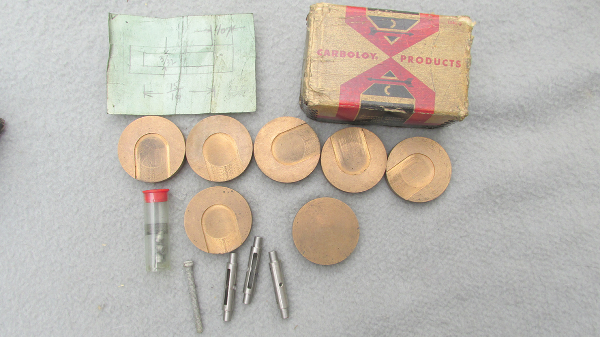 Item No. 1262 is packaged in a Carboloy Products box. It has seven copper-colored, 1 2/3-inch, 4.4-ounce round disks. Six of the disks have an indentation and one is solid. It also has three small screws in a tube, one long screw and three 1 2/3-inch small metal rollers with a screw hole in the middle of them and a longer slit for something to be inserted.