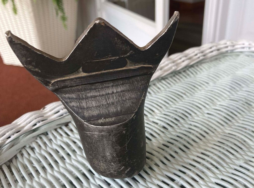 Chris Heilman, of Kittanning, Pennsylvania, said Item No. 1191 was found in the woods. It is not rusted even though it has been in the ground for 70-plus years. It is heavy, feels like lead, but it is not soft. It is nonmagnetic and is not brass or copper. It looks to have been stamped and has no holes in it.