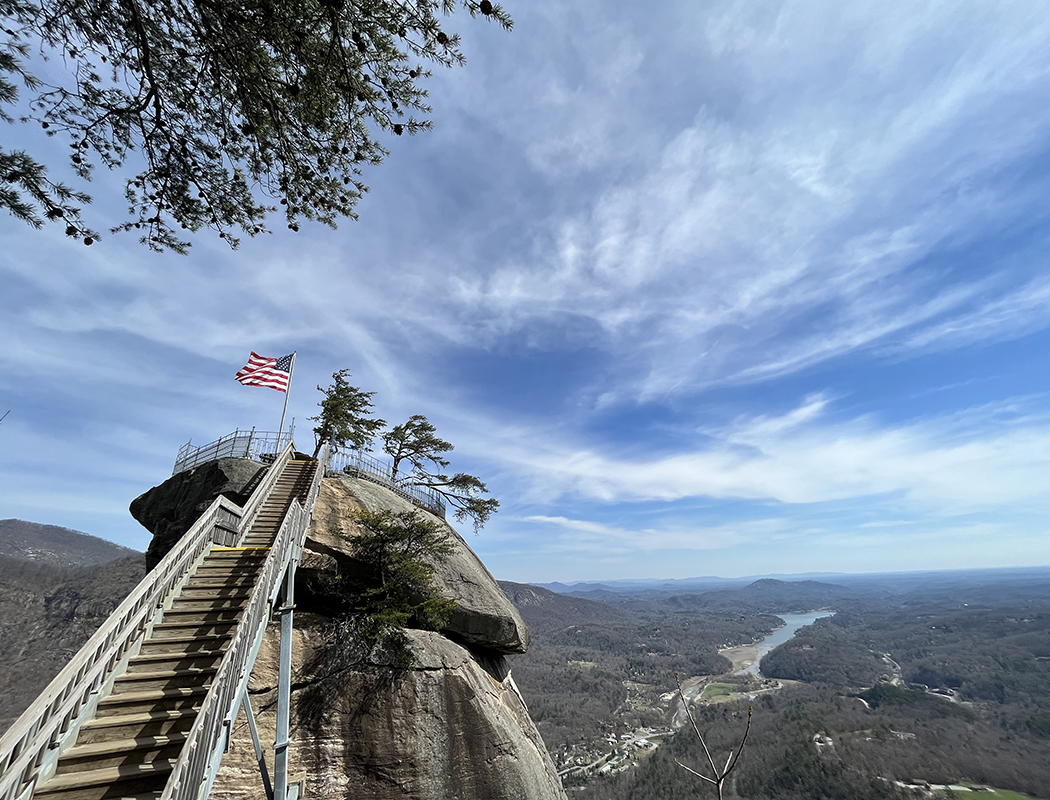 Now a state park, the area still offers breathtaking panoramic views of Hickory Nut Gorge from the top of Chimney Rock. An elevator is an option for part of the climb, but we chose to take the 499 steps one way to reach the flag at the very top. I’m still not sure how I managed the climb. I hugged a tree and sat securely in the middle of the fenced area at the pinnacle.