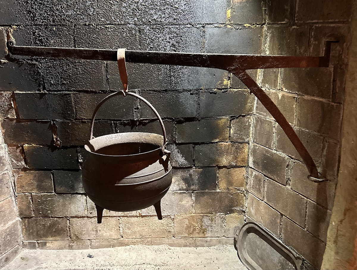 Cooking fireplaces often integrated a storage space for logs that would be used in cooking, a so-called “beehive” brick oven for baking purposes and notches for the ends of a “lug pole” (made from a sturdy sapling) positioned across the throat of the chimney. On this could be hung various kinds of iron trammels that allowed pots to be moved closer to or farther from the fire. The fireplace and hearth were truly the heart of the house since so many of life’s daily activities centered around it.