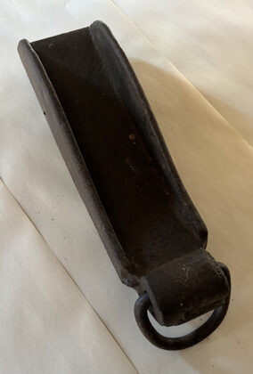 A cast iron device called a “drag shoe” was also standard equipment. This heavy curved shoe, about a foot in length, fit over the iron wheel rim and was designed to help supplement the wagon’s brakes in slowing the vehicle as it traveled down a grade so that it wouldn’t run over the team pulling it. The drag shoe was held in place during the descent by a rope attached to it.