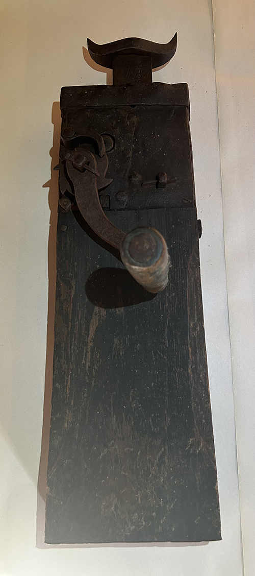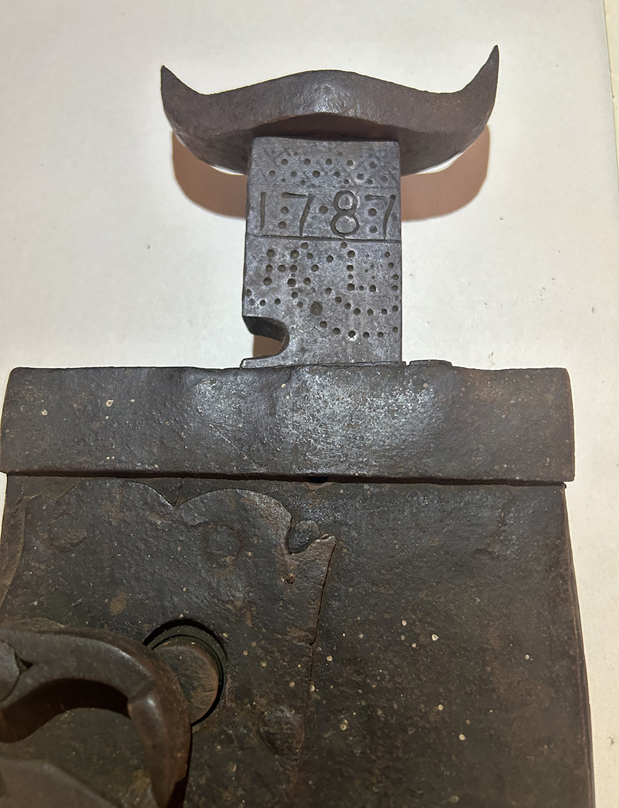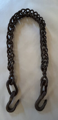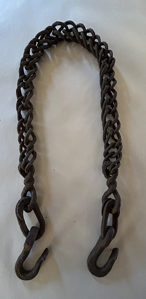 Few intact Conestoga tool boxes with outstanding ironwork survive today, and when they come on the market command eye-popping prices. One such box sold at a prestigious Pennsylvania auction house in 2018 for a gavel price of $19,000. Various other Conestoga hooks, chains, levers and locks that incorporate similar folk motifs also command high prices.