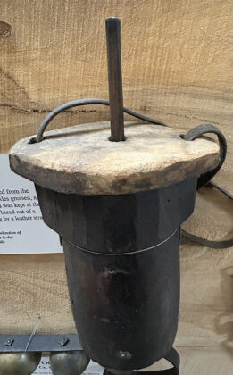 Another piece of standard equipment carried aboard the Conestoga wagon was the tar bucket, which was suspended from the body above the rear axle. The bucket, usually little more than a reamed-out piece of log with a wooden lid, held the tar or grease that was used to lubricate the wheel hubs. The handle of a small wooden applicator protruded through the top of the bucket.