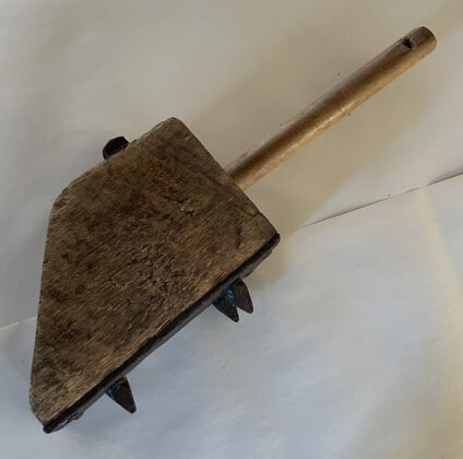 Also carried aboard the wagon was a wheel chock to prevent the vehicle from rolling forward or backward if it had to park on an incline. The chock was usually a wedge-shaped block of wood from which protruded a handle to help set it into place under the wheel. On its underside, the chock usually had a heavy iron plate fitted with multiple sharp iron spikes to keep it anchored in the ground.