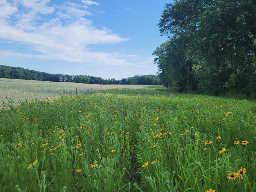 Improving and expanding habitat along field borders, fence rows, creeks and ditches, roadways, utility easements or railroad tracks is great place to start. These linear features often run across property lines and act as “corridors.” You may go so far as to plant native trees, shrubs, grasses or wildflowers to create new habitat. However, there are various low-effort options, as well. This can include reduced mowing, leaving buffers of unharvested crops or letting field edges grow up into grass and brambles. These options all provide areas for wildlife to forage, avoid predators and hide from human activity as they move between patches.