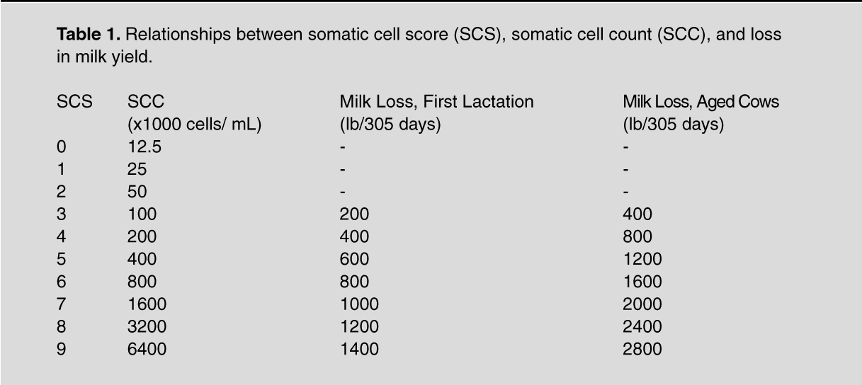 As was mentioned earlier, loss of milk production is the major cost to mammary infection. Milk loss caused by an infection in older cows is greater than for first-lactation cows, a loss of about 400 and 200 pounds/lactation, respectively, for each increase in linear somatic cell score (SCS) above 2 [or doubling of somatic cell count (SCC)] (Table 1).