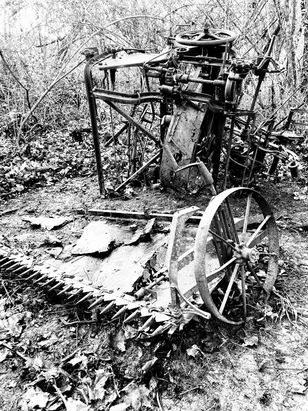 Gordon Matthews, of New Plymouth, Ohio, sent two pictures of a recent find on his property in southern Ohio. “Hidden in the woods is this mysterious farm implement. The taller section appears to be laying on its side and is roughly 6 feet tall (long) and has numerous sprockets, rollers and chain drives. The other section is not attached and was laying several feet away and has a flat metal tray on the bottom.”