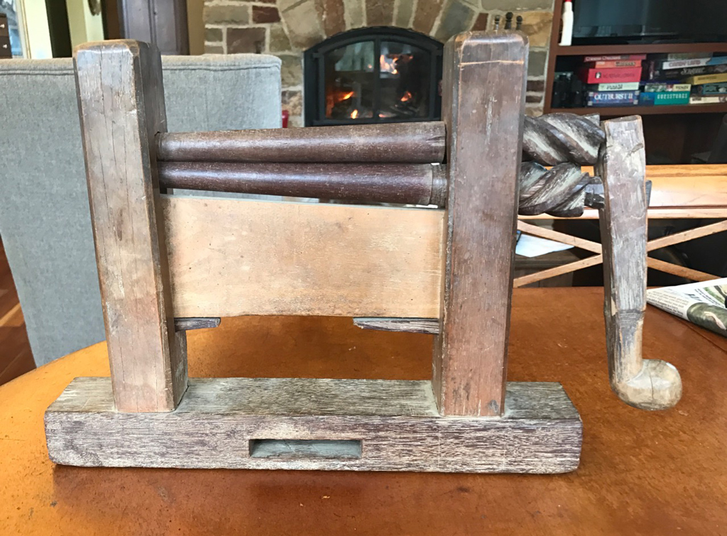 Item No. 1078 comes from Ed Homer, of Transfer, Pennsylvania, who has collected primitives for some time, but this one has him stumped. The unusual walnut piece is 14 inches wide and 11 inches tall. The two hand rollers have carved gears on the end, and then taper down to the other side of the piece. The wedge-like piece under the rollers can be adjusted up or down.