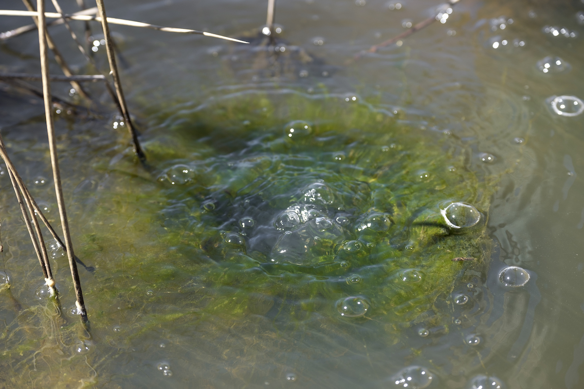 Gas bubbles up through a water-filled trench around the McCallion well, at the edge of a hay field, in Hartford Township, Ohio. (Matt Chasney photo