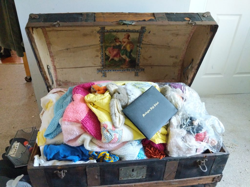 One of the first pieces of furniture we faced was an old steamer trunk. Wood and leather. It had been years since I had bothered to open it up. I had the vague sense that it contained belongings of Mr. Wonderful and I pre-marriage.