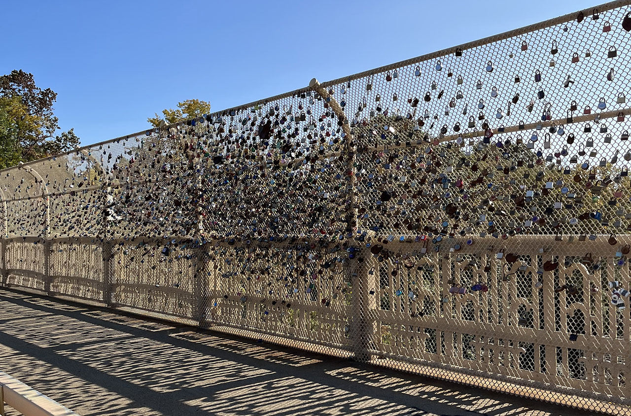 The tradition of putting a lock on a bridge comes from Paris. Lovers profess their undying love for each other before they toss the key into the Seine River for good fortune. In Oakland, this translates into combination locks on a 125-year-old bridge over Panther Hollow.