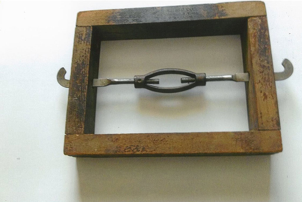 Hazard Item No. 1143 - Wooden box frame with two hook and screw ends with an oval shaped metal piece connecting the two screw ends in the middle of the box.